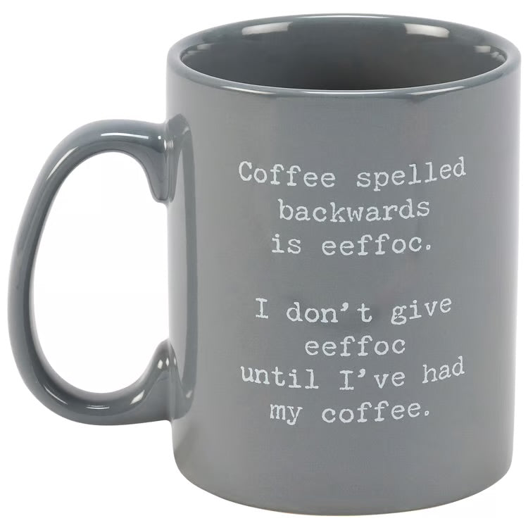 A stoneware 20 oz mug from our Trash Talk By Annie Collection displaying a double-sided design of a humorous coffee-themed sentiment in a vintage style. Funny mug sentiment reads "Coffee Spelled Backwards Is Eeffoc. I Don't Give Eeffoc Until I've Had My Coffee." Our Coffee Backwards mug is conveniently microwave, oven, dishwasher, and food safe for easy cleaning and use. A fun vintage style gift perfect for everyday drinkware.