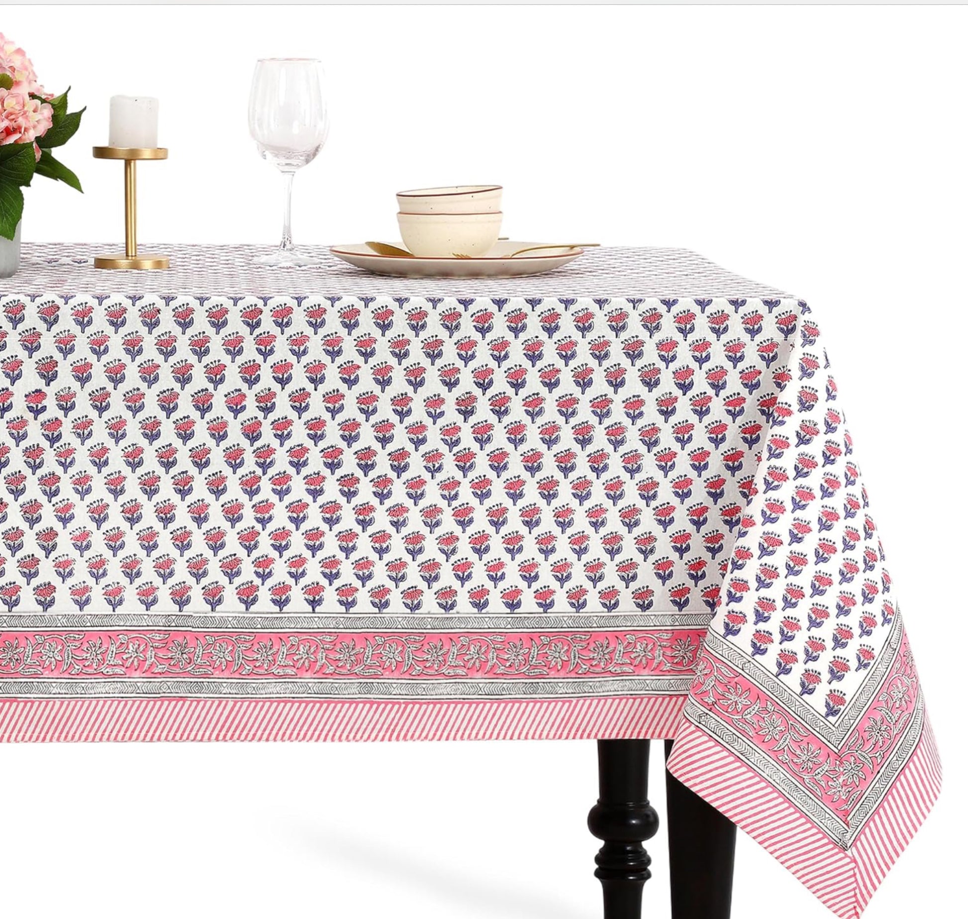 - PACKAGE INCLUDES: 1 Cotton Print Club Indian Square tablecloth measuring 60x60 Inch (152x152 cm). This designer pink floral tablecloth is made in India and is made using the hand stamping technique.